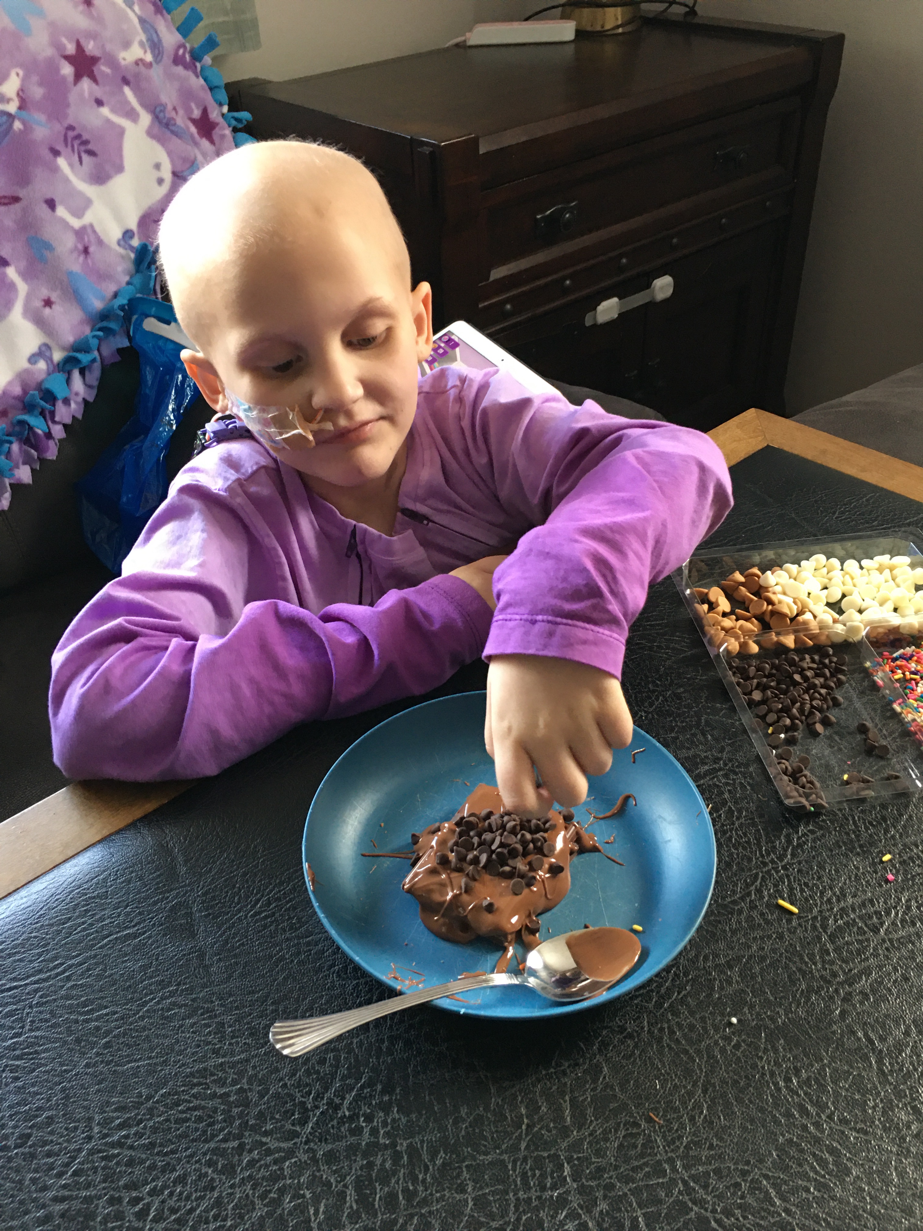 Two days ago Kylie completed her 20th chemotherapy treatment . Her doctor is happy with how quickly she has recovered from radiation. Her appetite is improving, she is relying on her ng tube less, and her blood work looked great this week!