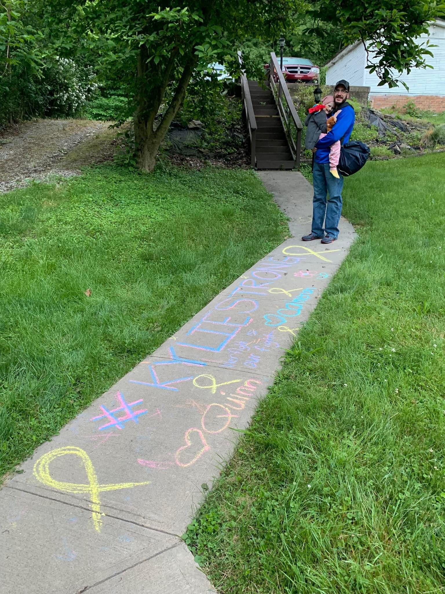 Kylie completed her 1st day of radiation yesterday . She played games with Child Life while she waited to get started. Quinn and Cameron helped Kirsten make a chalk message for Kylie to see as she left in the morning.
